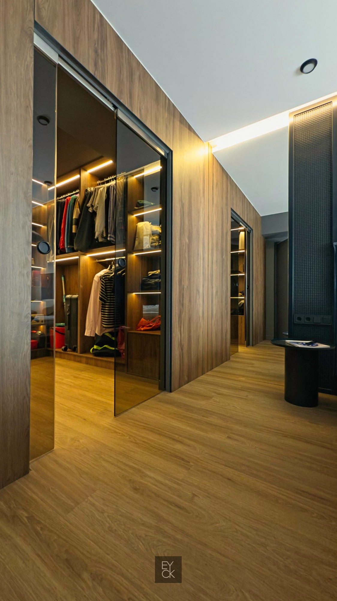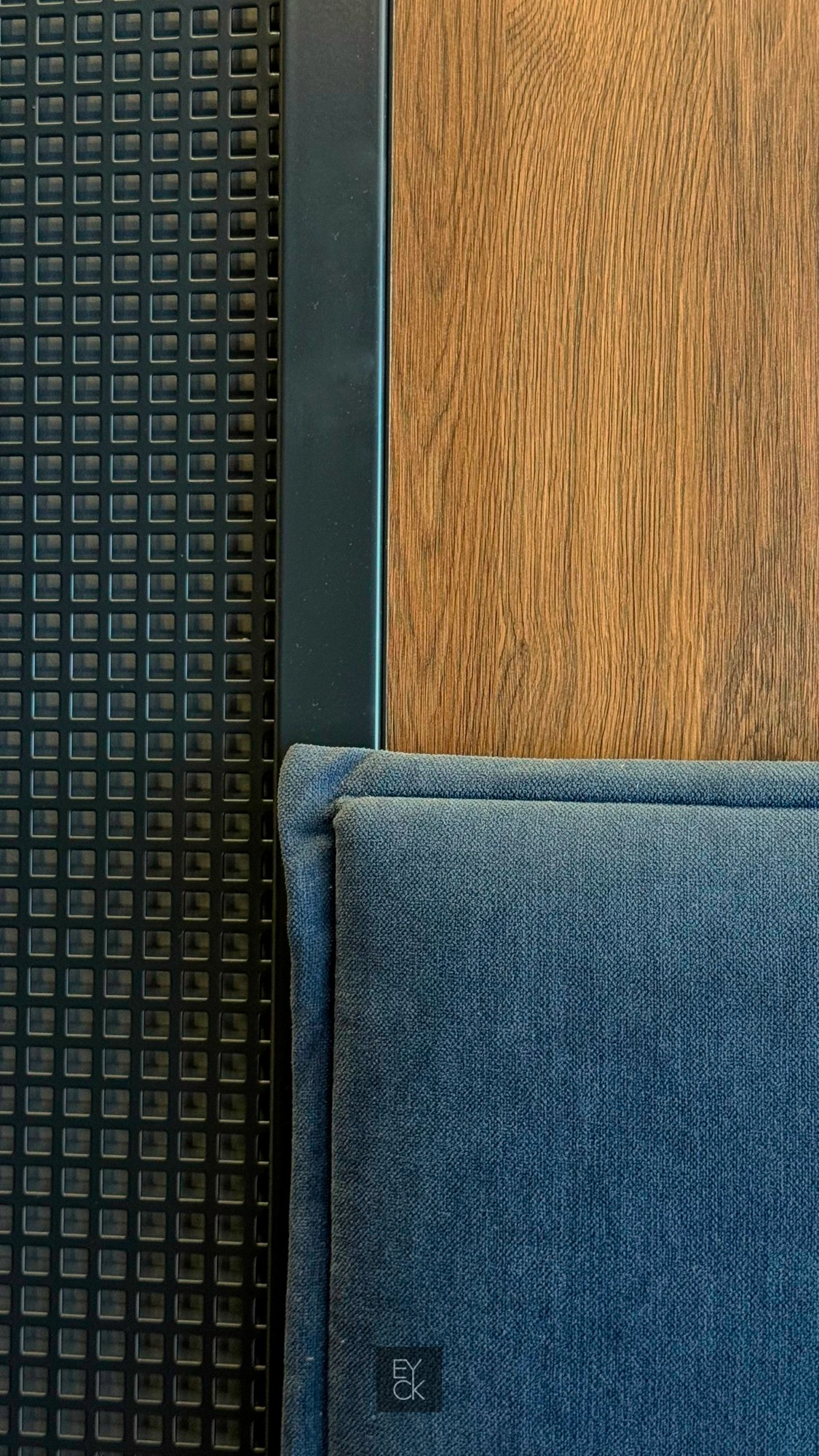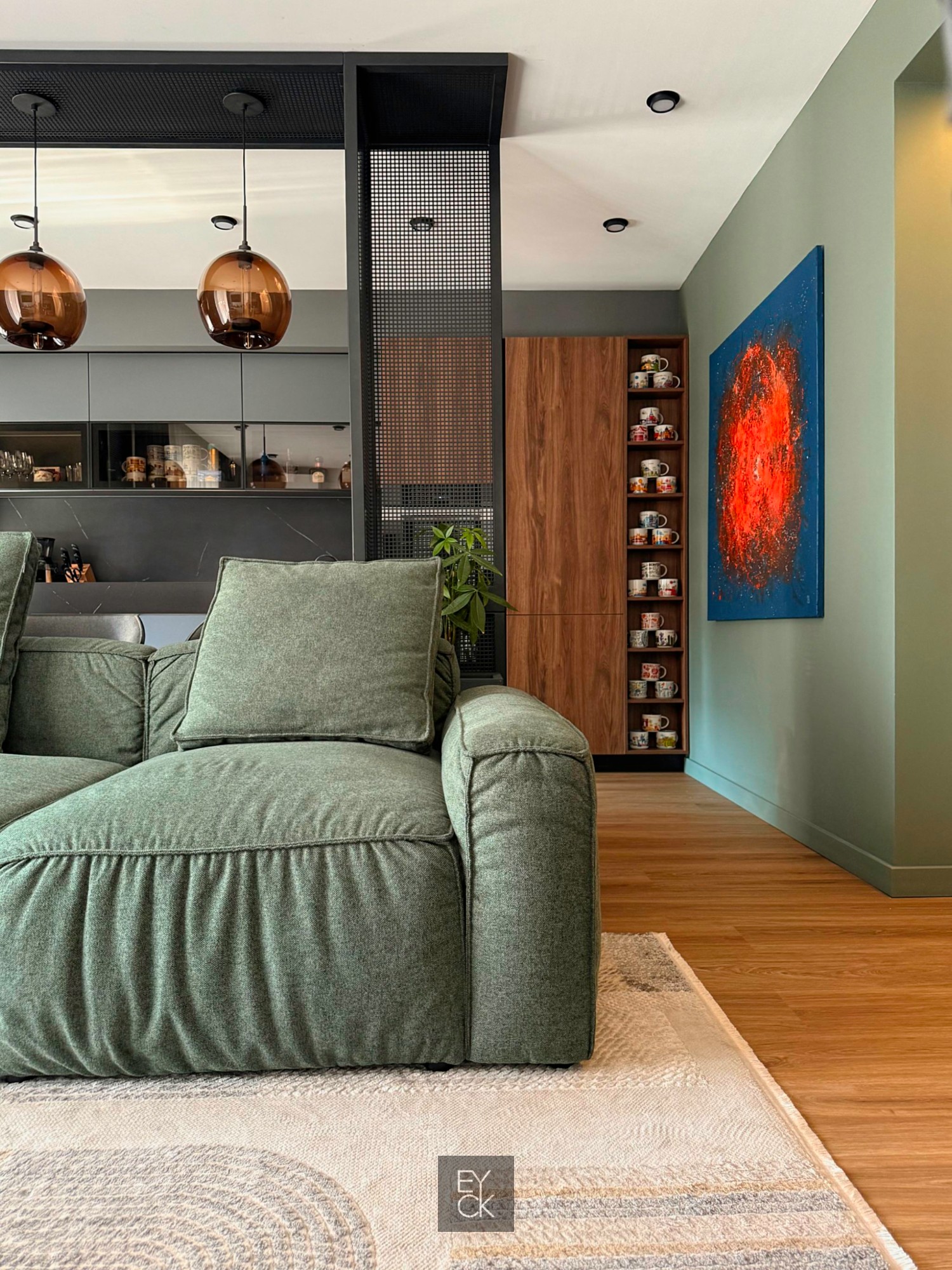 Prima propunere a pornit de la o paletă de culori bazată pe antracit, lemn și accente portocalii. Pe parcurs, conceptul a evoluat, fiind completat cu un verde oliv închis, prezent atât pe pereți, cât și pe canapeaua din living. Această nuanță a devenit elementul definitoriu al apartamentului, conferindu-i căldură și echilibru, păstrând totodată caracterul modern.