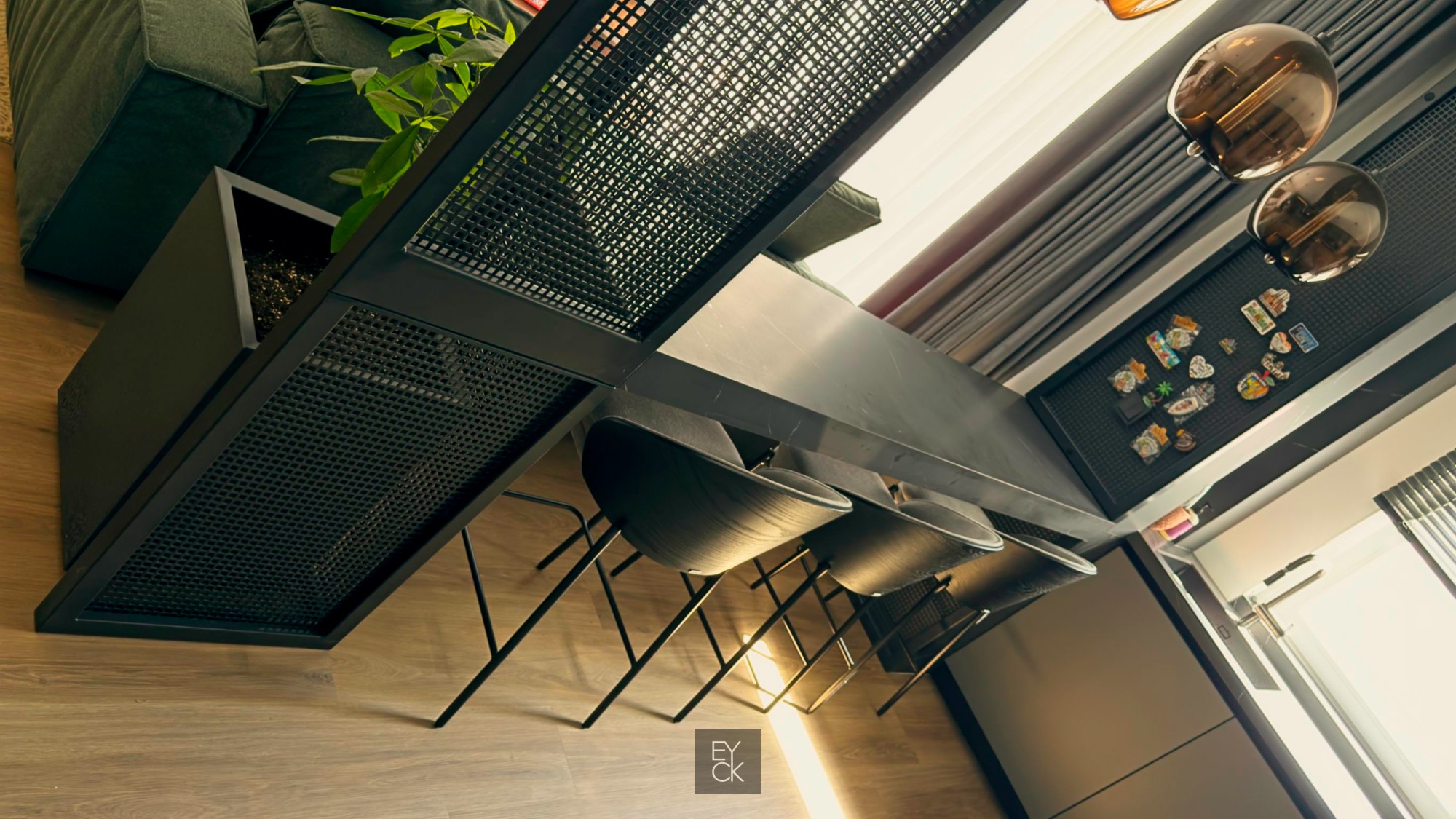 Un alt element central este structura metalică cu placă perforată, care delimitează bucătăria de living și susține blatul ceramic. Aceasta funcționează atât ca bar, cât și ca zonă de dining, integrând un accent industrial vizual puternic și răspunzând perfect nevoilor beneficiarului.