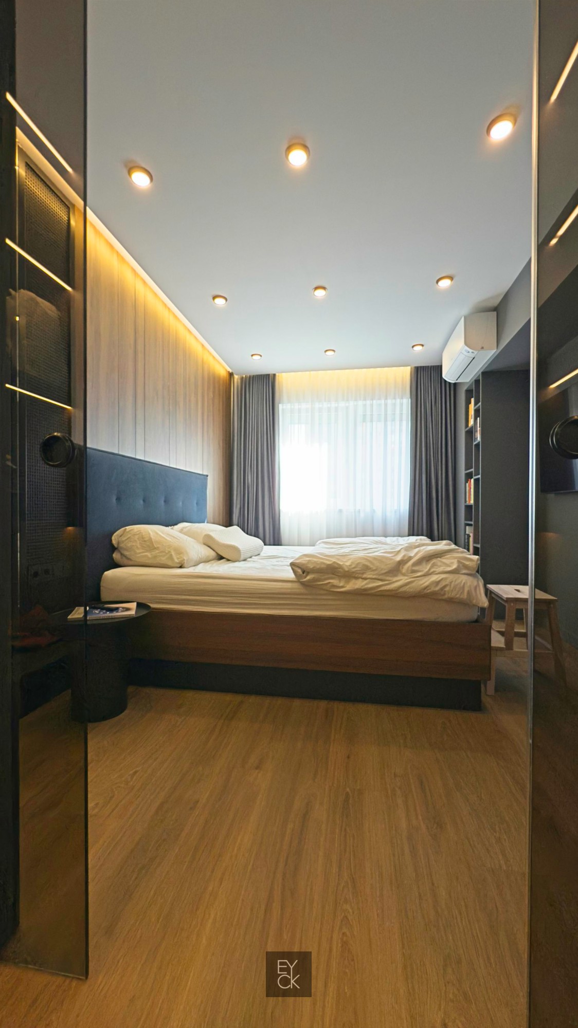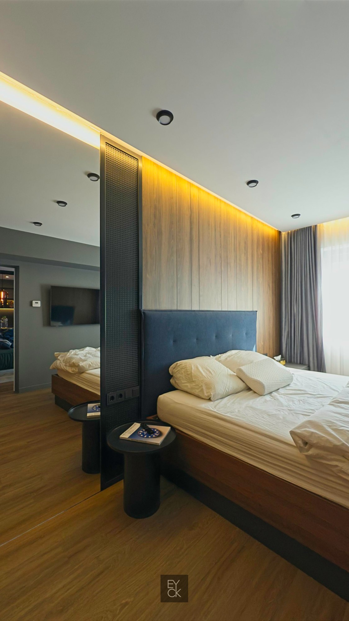 Pentru acest apartament situat în cartierul Ioșia din Oradea, am creat un design interior modern cu accente industriale, adaptat nevoilor unui tânăr profesionist din domeniul IT. Suprafața de 56 mp a fost optimizată pentru a oferi atât un spațiu de relaxare, cât și unul funcțional pentru munca de acasă. într-un spațiu gândit inițial doar din perspectiva construcției.