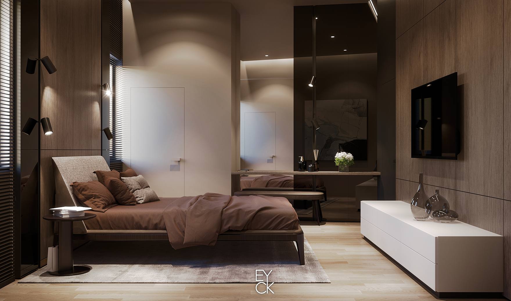 Aici totul devine mai liniștit. Am optat pentru culori neutre, texturi moi și iluminat discret. Dormitorul nu trebuie să epateze, ci să îmbrățișeze. Am urmărit să creez o atmosferă de refugiu, unde mintea și corpul se pot odihni.