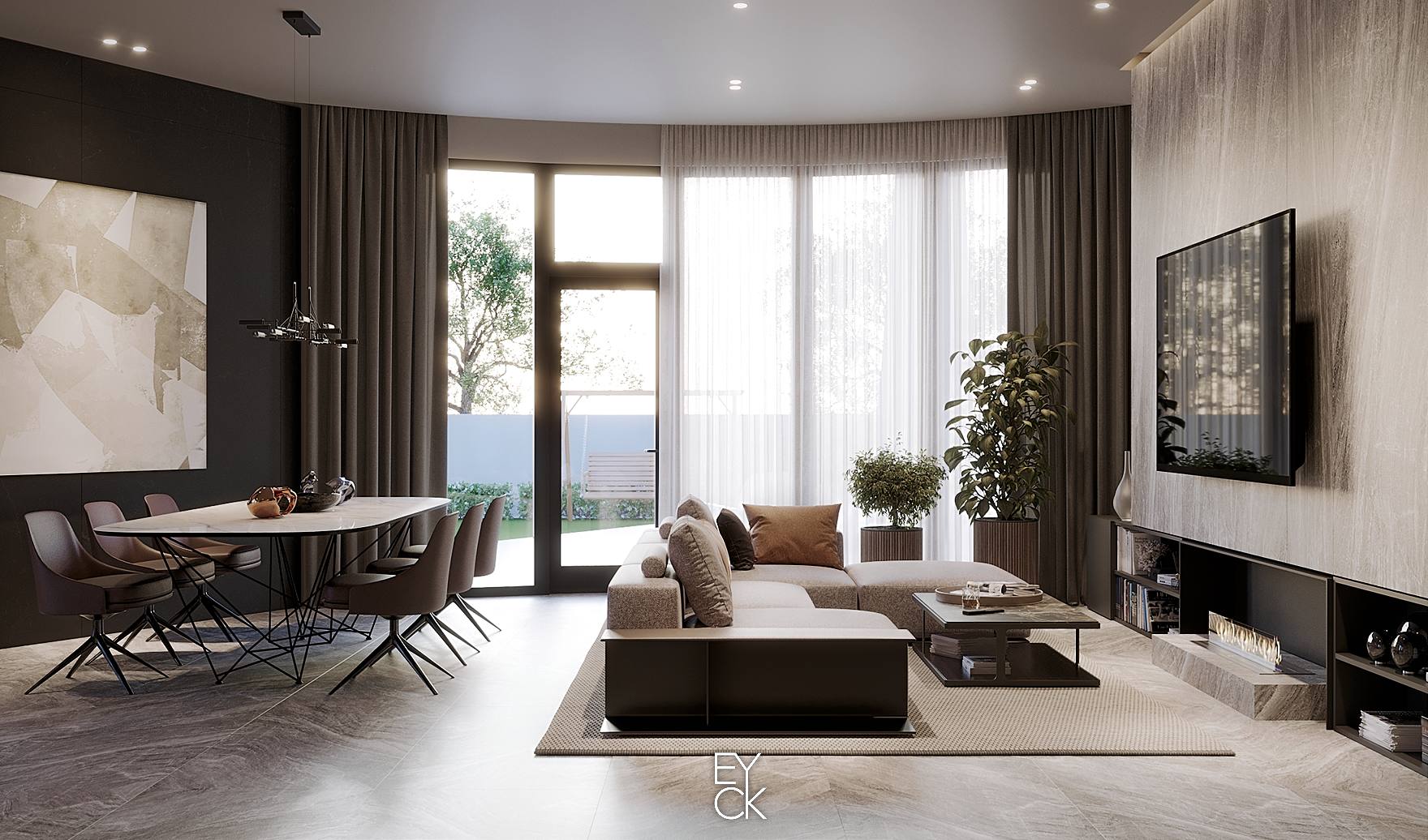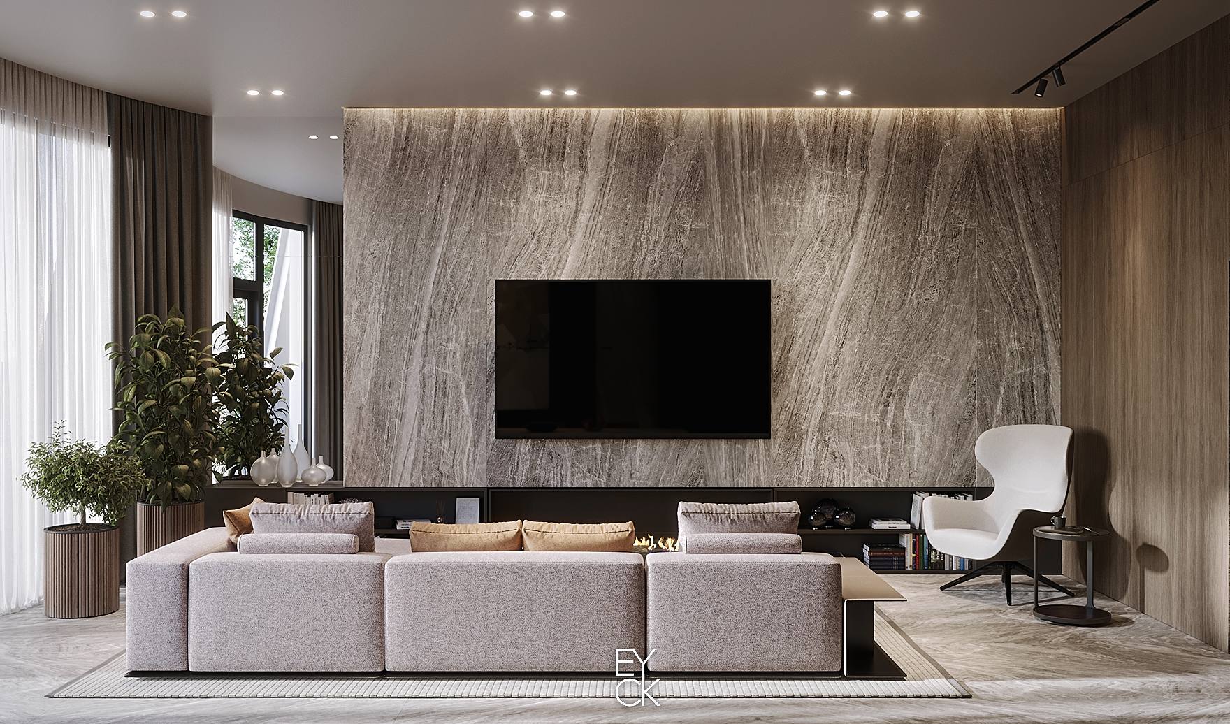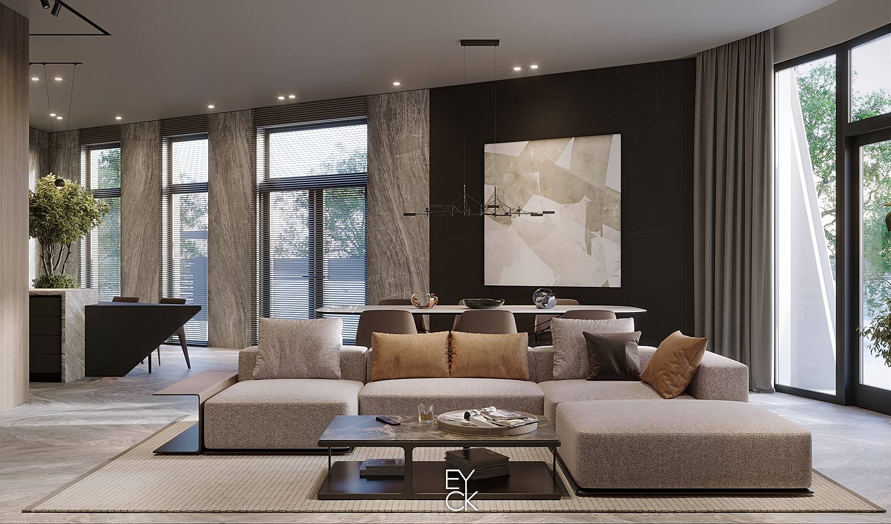 Livingul e scena principală a casei. Am vrut ca aici să se simtă imediat personalitatea vilei: modernă, dar nu rece; sofisticată, dar accesibilă. Contrastul dintre mobilierul simplu și texturile bogate creează un echilibru subtil. Lumina naturală se îmbină cu cea artificială, iar rezultatul este o atmosferă mereu schimbătoare, în funcție de momentul zilei.